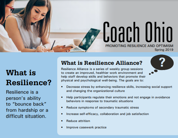 Project kickoff events were held in each county for RA participants, with refreshments, to generate excitement about the initiative. Each participant received the Resilience Alliance Participant Manual and learning aids branded with the Coach Ohio logo and messages to reinforce the project messages (e.g., hot/cold gel packs for sore spot relief, modeling putty with the message “I’m resilient”, and bendy sticks with similar messages).