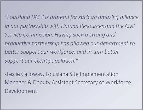 In our work with various child welfare jurisdictions, we have observed varying degrees of collaboration between HR and child welfare. In some jurisdictions, our project has benefited from existing close relationships and has facilitated stronger collaboration between HR and child welfare. For example, in Louisiana, HR and Civil Service representatives were integral to the process of establishing a new job title as part of a redesign of frontline child welfare work. These professionals were at the table from the very beginning of the needs assessment process, through the development and initial implementation of the workforce intervention. Without this collaboration, it would have been impossible for the child welfare division to conduct the necessary job analysis, develop the job classification and appropriate level of compensation, and make the business case for creating these new positions. In another example, the QIC-WD worked with a joint team of Oklahoma child welfare and HR leaders to develop a competency-based hiring process. Without the active collaboration and support of HR professionals the goals of this project could not have been accomplished.